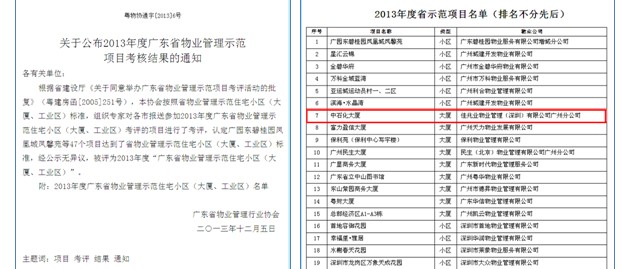 年底收官,喜事连连。广州中石化大厦在2013年度创建广东省物业管理示范项目工作中,突出重围,管理服务各方面工作均得到考评专家的一致好评,获得广东省物业管理示范大厦荣誉称号。这份荣誉是广州物业公司、广州中石化大厦项目全体人员辛勤汗水的结晶,是九游会官网物业在广州的又一个里程碑。