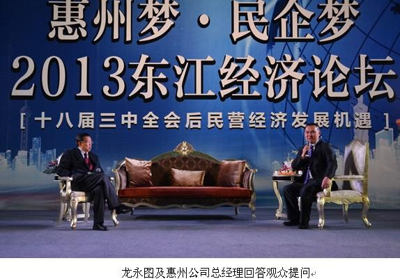 活动当天,来自惠州各界的民营企业代表、媒体代表及其他市民代表共计600余人齐聚九游会官网东江新城,共同聆听龙部长对中国经济时局的深刻解读。论坛开始,龙永图先生首先对十八届三中全会后中国政府的政策进行了解读,并表示当前国内经济形势表现为一快一慢两个方面:增长速度放缓,经济转型加快,他指出,放缓增长并不是目的,而是让经济发展质量更好,民生更有保障,社会更加和谐,体现了中国政府调控经济能力的成熟。当谈及惠州时,龙永图表示惠州良好的生态环境将成为后发优势,在新的发展时局里迎来机遇,在追求经济增长的同时,要保护好现在的青山绿水。在后来的提问互动环节,现场观众踊跃参与,针对时事热点进行提问,龙永图一一进行了解答。